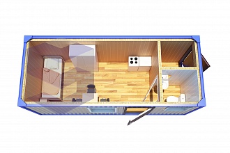 Универсальное место отдыха для строителей. В помещении есть все условия, чтобы рабочие могли переодеться, пообедать, набраться сил. Качественная теплоизоляция обеспечивает комфортный микроклимат в любое время года. Помещение надежно защищает людей от ветра и непогоды. Подобные бытовки могут использоваться как в жарких, так и в холодных северных регионах.